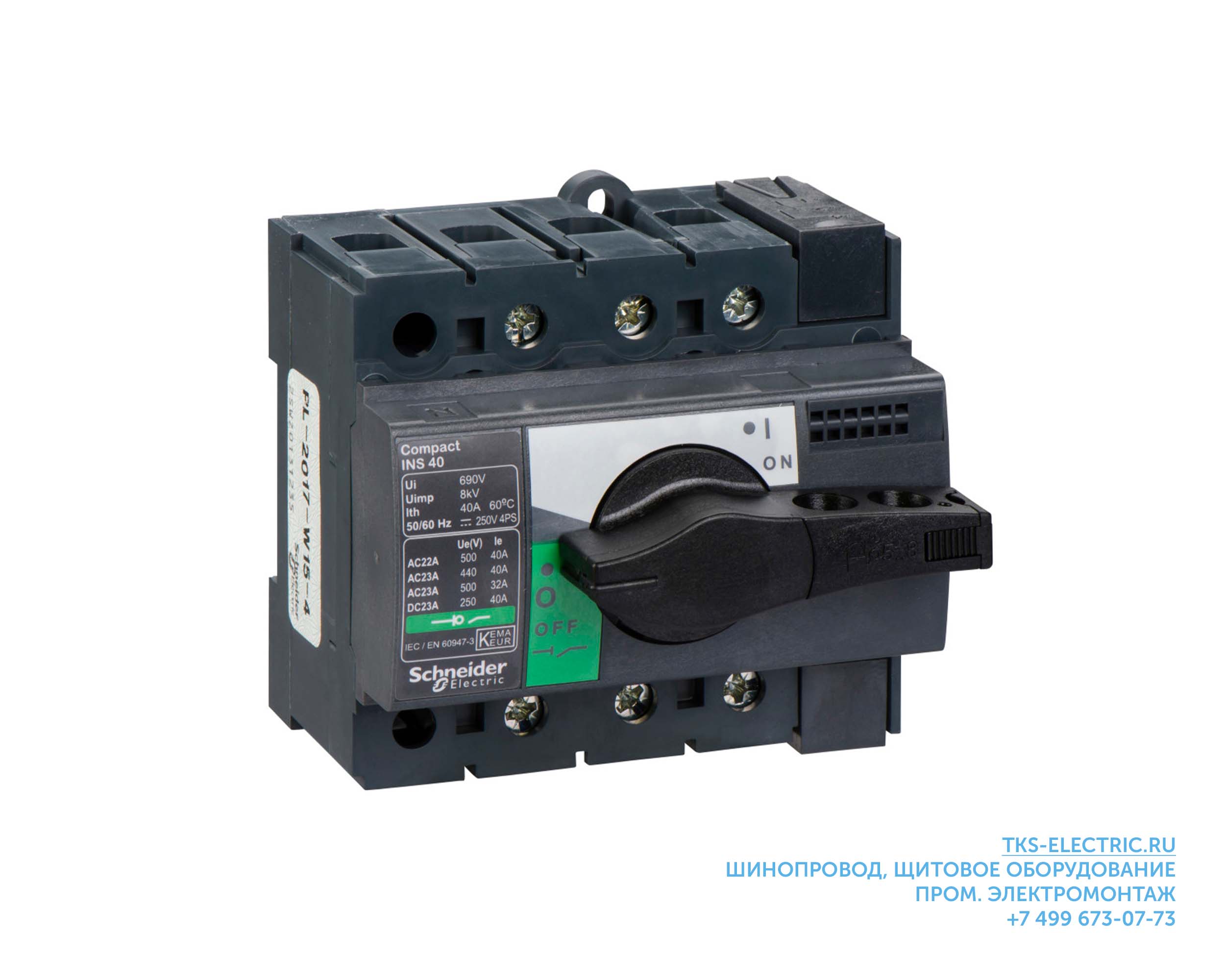 Выключатель-разъединитель INS40 на 1 направление, 3-полюсный, 40А, до ≈20кВт [3ф], фронтальная поворотная рукоятка, торцевые зажимы [окно 13мм], без видимого разрыва, с д/г.камерами, на DIN-рейку / монтажную панель, IP40