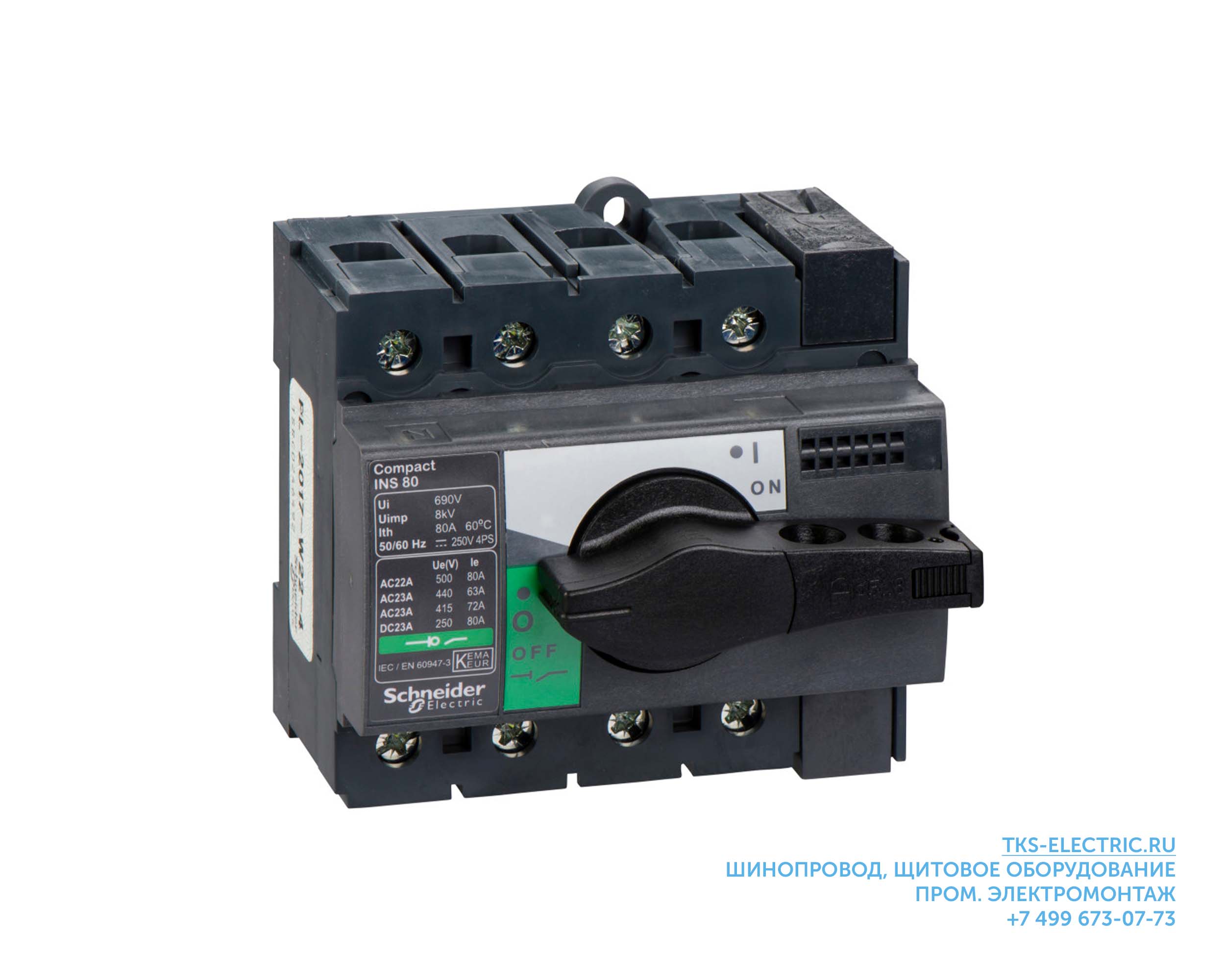 Выключатель-разъединитель INS80 на 1 направление, 4-полюсный, 80А, до ≈41кВт [3ф], фронтальная поворотная рукоятка, торцевые зажимы [окно 13мм], без видимого разрыва, с д/г.камерами, на DIN-рейку / монтажную панель, IP40